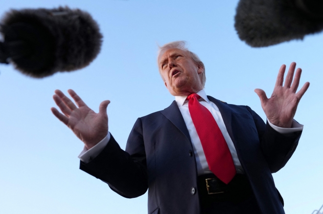 도널드 트럼프 미국 대통령이 2025년 9월 7일(현지시간) 메릴랜드주 앤드루스 합동기지에서 에어포스원에서 내려 기자들과 대화하고 있다. 트럼프 대통령은 앞서 뉴욕에서 열린 US오픈 남자 단식 결승전에 참석한 뒤 귀국했다. AFP 연합뉴스 |