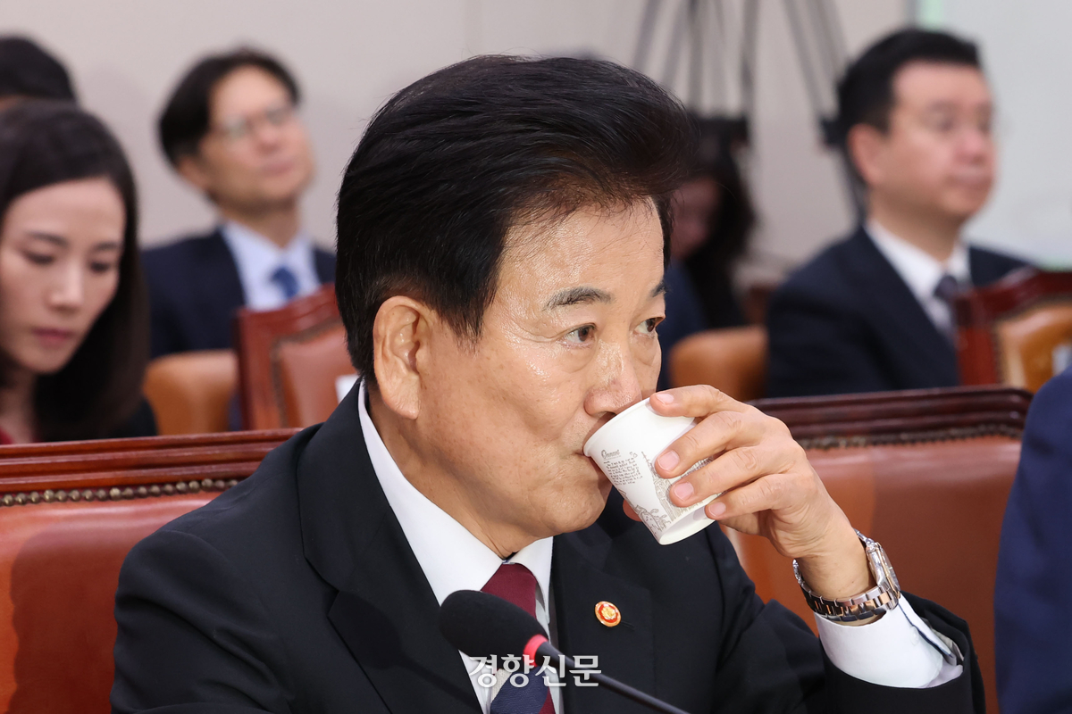 정동영 통일부 장관이 8일 국회에서 열린 외교통일위원회 현안 질의에 출석해서 물을 마시고 있다. 한수빈 기자 |