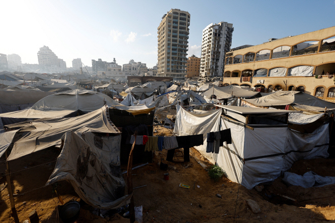 이스라엘의 공습이 계속되고 있는 가운데, 8일(현지시간) 가자시티 천막촌에 빨래가 걸려 있다./로이터 연합뉴스 |