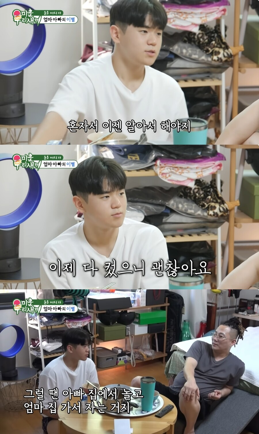 윤민수가 "나중에 엄마, 아빠가 같이 안 지내는 모습을 보면 어떨 거 같냐. 괜찮냐"라고 묻자 윤후는 "네. 뭐. 생각보다 (괜찮다). 이제 혼자 알아서 해야한다. 학교 잘 다니고. 혼자 알아서 잘 살아야지"라고 답했다.