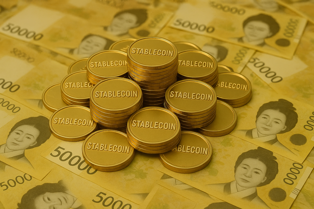5만원권 지폐 위에 쌓여 있는 스테이블코인을 형상화 한 모습 [챗GPT를 이용해 제작함] |
