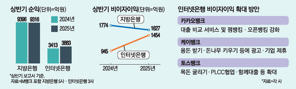 가장 큰 차이는 비이자이익이다. 인터넷은행 3사의 올해 상반기 비이자이익 합계는 1454억원으로 전년 동기 945억원보다 54% 증가했다. 반면 지방은행 5사는 비이자이익이 지난해 상반기 1774억원에서 올해 상반기 1627억원으로 8% 감소했다.