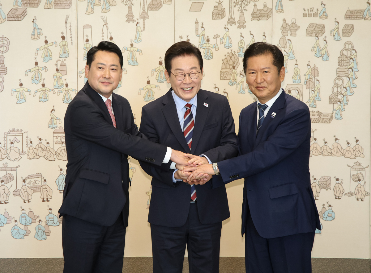 이재명 대통령이 8일 용산 대통령실에서 정청래 더불어민주당 대표, 장동혁 국민의힘 대표와 오찬 회동 전 기념 촬영을 하고 있다. 대통령실사진기자단 |