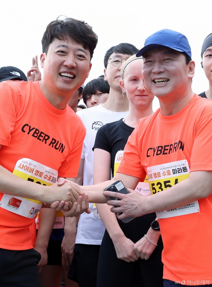 (서울=뉴스1) 박정호 기자 = 이준석 개혁신당 대표와 안철수 국민의힘 의원이 7일 오전 서울 여의도 한강공원 물빛무대에서 열린 2025 제17회 사이버 영토 수호 마라톤대회에서 5km 출발 전 악수를 나누고 있다. 2025.9.7/뉴스1 Copyright (C) 뉴스1. All rights reserved. 무단 전재 및 재배포, AI학습 이용 금지. /사진=(서울=뉴스1) 박정호 기자 |
