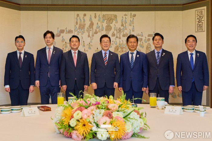 [서울=뉴스핌] 이재명 대통령(가운데)이 8일 서울 용산 대통령실에서 열린 여야 지도부 오찬 회동에서 정청래 더불어민주당 대표(오른쪽 세번째), 장동혁 국민의힘 대표(왼쪽 세번째)와 기념촬영을 하고 있다. [사진=대통령실] 2025.09.08 photo@newspim.com