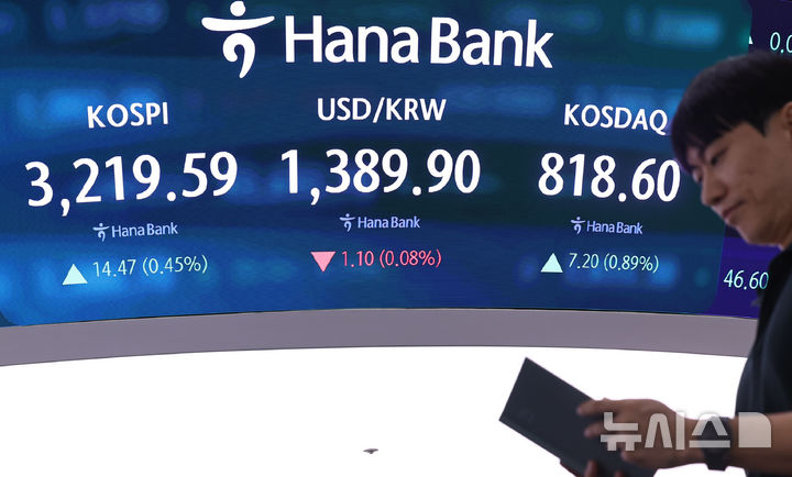 [서울=뉴시스] 최진석 기자 = 코스피가 전 거래일(3205.12)보다 14.47포인트(0.45%) 오른 3219.59에 마감한 지난 8일 오후 서울 중구 하나은행 딜링룸 전광판에 지수가 표시되어 있다. 2025.09.08. myjs@newsis.com |