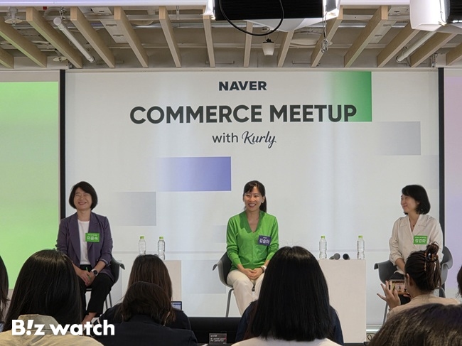 네이버와 컬리가 9일 네이버스퀘어 종로에서 기자 간담회를 열고 커머스 사업 전략을 발표하고 있다.사진 왼쪽부터 이윤숙 네이버 쇼핑사업 부문장, 김슬아 컬리 대표, 정경화 네이버플러스 스토어 프로덕트 리더./사진=김동훈 기자 |