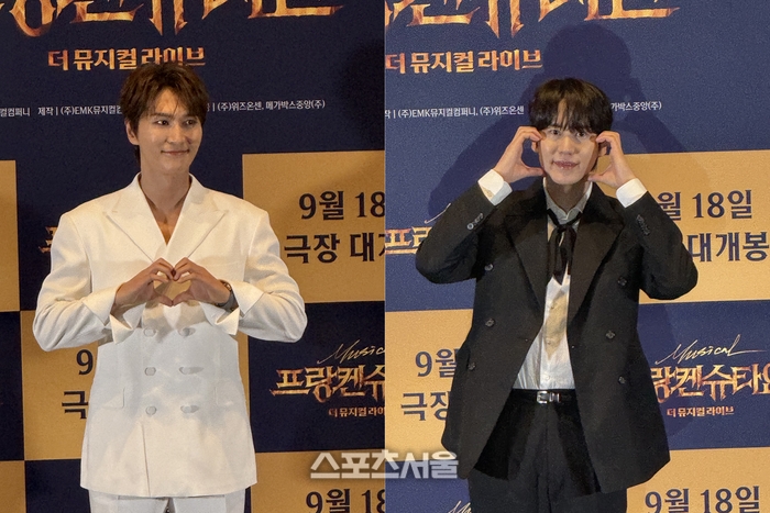 (왼쪽부터) 뮤지컬 배우 박은태와 규현이 9일 뮤지컬 실황 영화 ‘프랑켄슈타인: 더 뮤지컬 라이브’ 프레스콜에서 기념 촬영하고 있다. 사진 | 표권향 기자 gioia@sportsseoul.com |