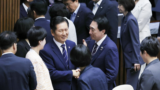 정청래 더불어민주당 대표(가운데)가 9일 오전 국회에서 열린 본회의에서 교섭단체 대표연설을 마친 뒤 박수현 의원 등과 인사하고 있다. 임현동 기자 |