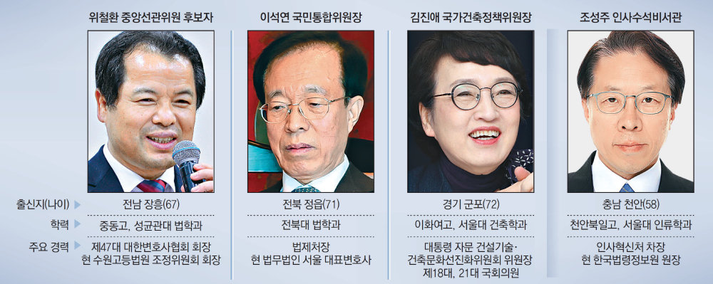 이 대통령은 중앙선거관리위원 후보자로 사법연수원 동기(18기)인 위철환 변호사를 지명했다. 부총리급 예우를 받는 대통령직속 국민통합위원장은 이석연 전 법제처장이 임명됐다.
