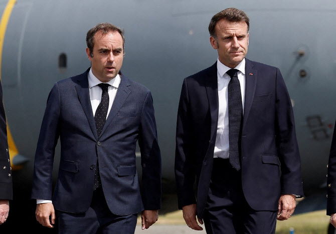 신임 총리로 임명된 세바스티앵 르코르뉴 총리(왼쪽)가 지난 6월20일 파리-르부르제 공항에서 열린 파리 에어쇼에서 에마뉘엘 마크롱 대통령과 함께 서 있다. (사진=AFP) |