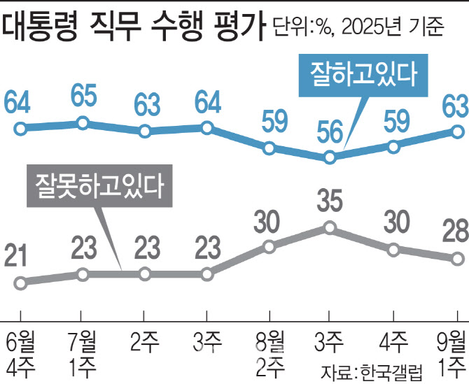 한국갤럽 9월 1주 차 조사에서 이 대통령 지지율은 63%를 기록하며 다시 60%대를 회복했다. 취임 100일 지지율이 가장 높았던 정부는 14대 김영삼 대통령으로 83%, 두 번째는 19대 문재인 대통령 78%였다. 15대 김대중 대통령은 취임 100일 지지도가 62%로 이재명 대통령과 비슷한 수준이다.