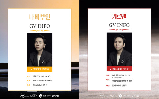 롯데시네마 월드타워에서 진행되는 ‘나비부인’ GV(17일)와 ‘카르멘’ GV(28일)에는 팝페라테너 임형주가 참석한다. 젊은 거장 임형주는 음악 영화 GV의 흥행 보증수표로서 관객들과 함께 오페라를 향한 뜨거운 애정을 나눌 예정이다.
