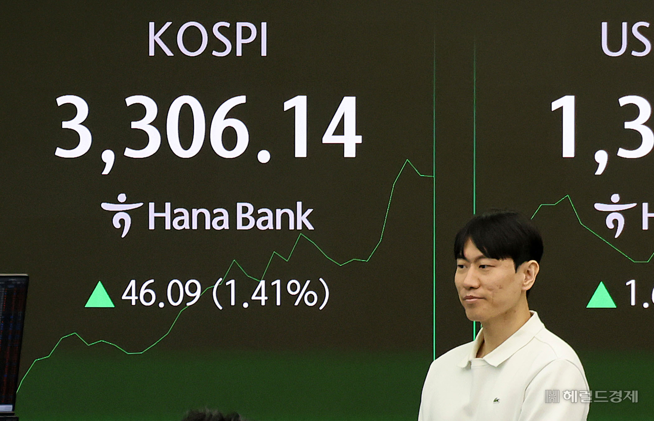 10일 코스피가 전고점을 돌파했다. 한국거래소에 따르면 코스피는 오전 9시 30분쯤 3306.34 포인트를 기록했다. 이는 지난 2021년 7월 6일 전고점(3305.21)을 기록한 이후 약 4년 2개월 만이다. 이날 오전 서울 중구 하나은행 딜링룸 전광판에 코스피 지수가 오전 9시 30분 기준 전 거래일보다 46.09포인트 상승한 3306.14포인트를 나타내고 있다. 임세준 기자 |