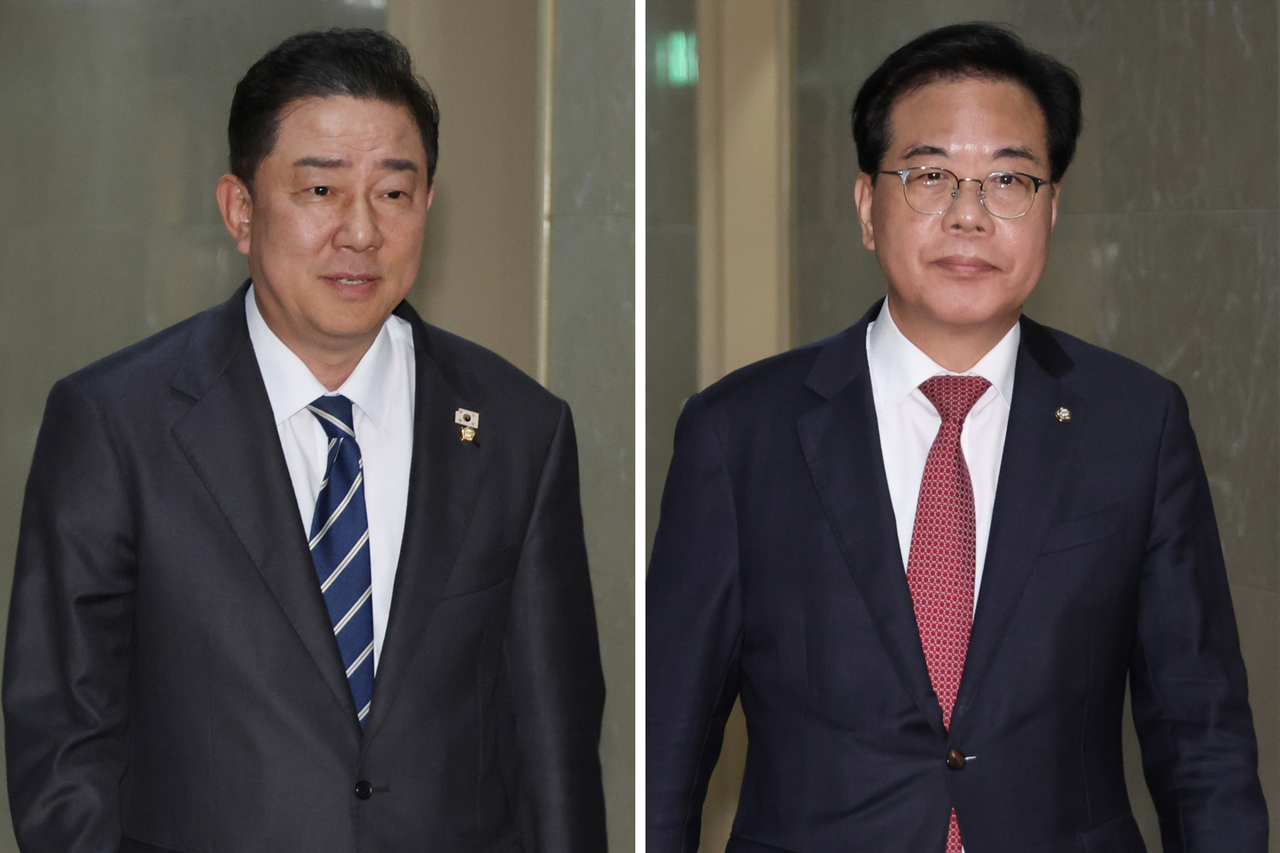 김병기(왼쪽) 더불어민주당 원내대표와 송언석국민의힘 송언석 원내대표가 9일 서울 여의도 국회에서 권성동 의원 체포동의안 표결 등 현안 관련 논의를 위해 운영위원장실로 들어가고 있다. [연합] |