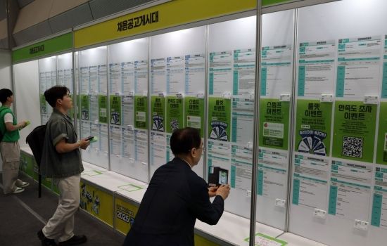 지난 6월 서울 코엑스에서 열린 강남구 취업박람회를 찾은 구직자들이 채용공고 게시판을 확인하고 있다. |