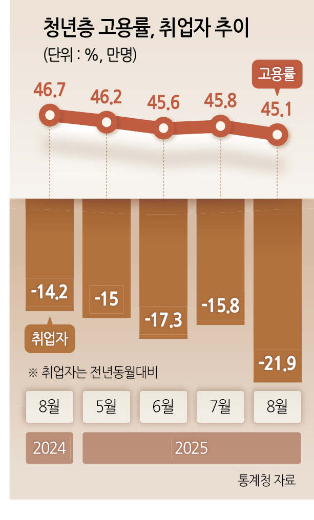 8월 청년층 취업자가 20만명 넘게 줄며 16개월 연속 감소세를 이어갔다. 15세 이상 전체 취업자 수는 2900만명에 근접했지만, 건설업·제조업과 청년층 고용 부진이 장기화하면서 고용 구조 불균형이 심화됐다. 정부는 새 정부 출범 후 첫 일자리 전담반(TF)회의를 열고 ‘청년고용올케어플랫폼’을 통한 미취업 청년 지원 강화에 나섰다.