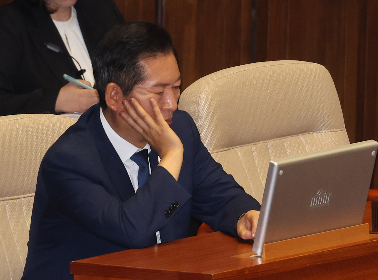 정청래 더불어민주당 대표가 10일 서울 여의도 국회 본회의에서 국민의힘 송언석 원내대표의 교섭단체 대표 연설을 듣고 있다. [연합] |
