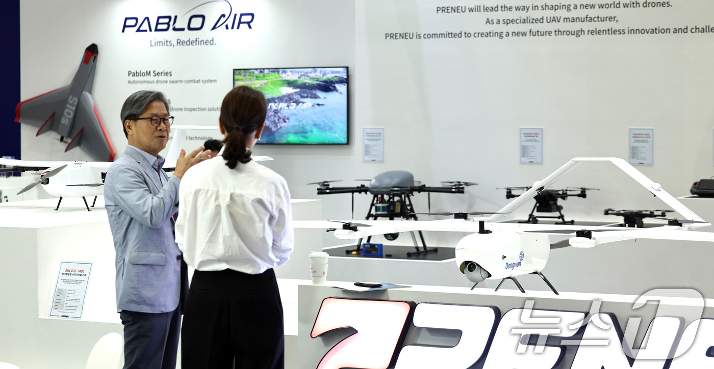 (고양=뉴스1) 구윤성 기자 = 10일 경기 고양시 일산 킨텍스에서 열린 제1회 대한민국 산업단지 수출박람회에서 참관객들이 다양한 드론을 살펴보고 있다. 2025.9.10/뉴스1