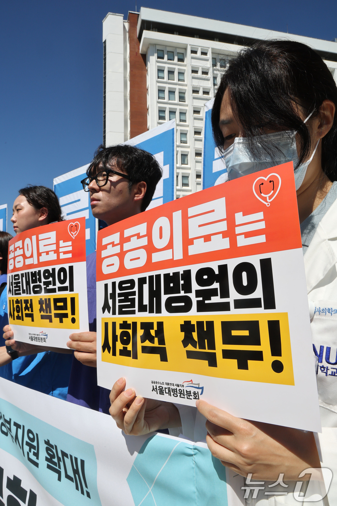 (서울=뉴스1) 이광호 기자 = 서울대병원 노조가 10일 오전 서울 종로구 서울대병원에서 가진 쟁의행위 찬반투표 결과 발표 및 총파업 선포 기자회견을 하고 있다. 서울대병원 노조는 의료인력 충원, 의료공공성 강화, 임금 체계 개편 등을 요구하며 오는 17일부터 총파업에 돌입할 예정이다. 2025.9.10/뉴스1