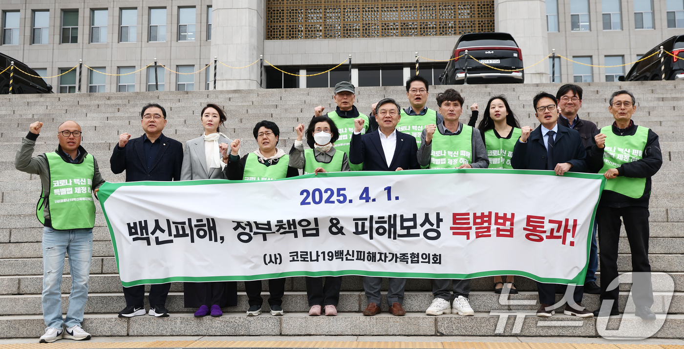 지난 4월 2일 코로나19 백신 피해자 유가족들과 더불어민주당 박주민 의원 등이 2일 오후 서울 여의도 국회 본청 앞에서 코로나바이러스감염증-19 예방접종 피해보상 등에 관한 특별법안(대안)이 본회의를 통과한 것에 대해 기뻐하고 있다. /뉴스1 ⓒ News1 김민지 기자 |