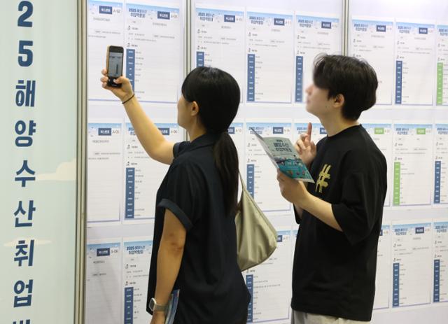 4일 부산 해운대구 벡스코 제2전시장에서 열린 '2025 해양수산 취업박람회'에서 청년 구직자들이 채용공고 게시판을 살펴보고 있다. 부산=연합뉴스 |