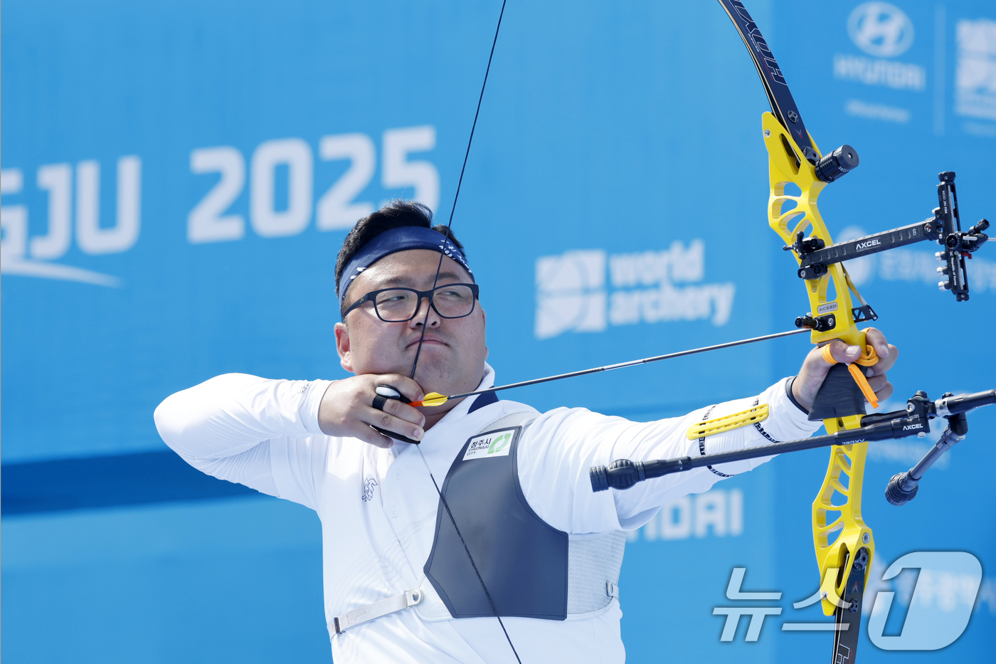 (광주=뉴스1) 김태성 기자 = 10일 오후 광주 동구 5·18민주광장에서 열린 2025 세계양궁선수권대회 리커브 혼성단체전 결승에서 한국 김우진이 화살을 쏘고 있다. 2025.9.10/뉴스1