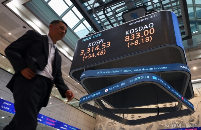 (고양=뉴스1) 구윤성 기자 = 10일 여의도 한국거래소 전광판에 코스피 종가 지수가 전일 대비 54.48포인트 상승한 3314.53을 나타내고 있다. 코스피는 종가 기준 처음으로 3310선을 돌파하며 지난 2021년 7월 6일(종가 3305.21) 이후 역대 최고치를 경신했다. 2025.9.10/뉴스1 Copyright (C) 뉴스1. All rights reserved. 무단 전재 및 재배포, AI학습 이용 금지. /사진=(고양=뉴스1) 구윤성 기자 |