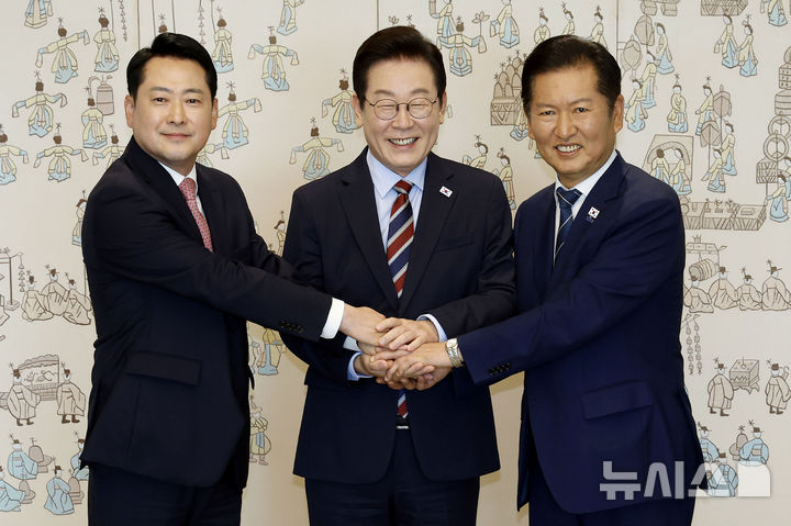 [서울=뉴시스] 최동준 기자 = 이재명 대통령이 8일 서울 용산 대통령실 청사에서 열린 여야 지도부 오찬 회동에서 정청래 더불어민주당 대표, 장동혁 국민의힘 대표와 기념촬영을 하고 있다. 2025.09.08. photocdj@newsis.com |