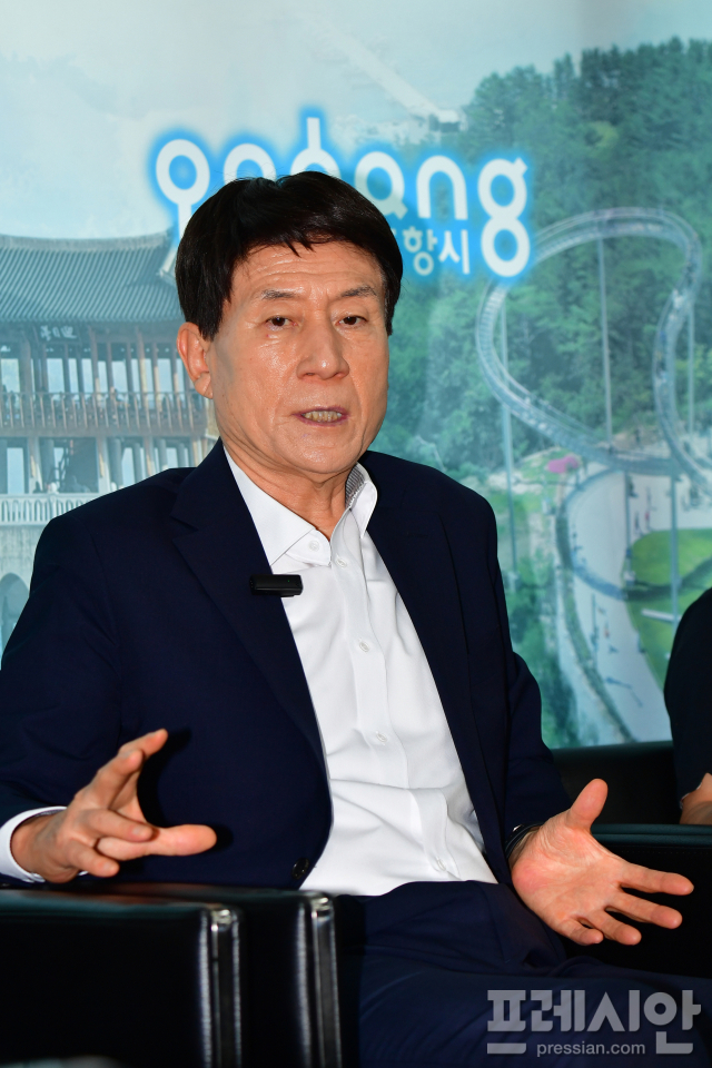 ▲이강덕 포항시장은 10일 시청 브리핑룸에서 이달 초 미국과 유럽 방문 성과를 설명하고 있다.ⓒ프레시안(오주호 기자) |