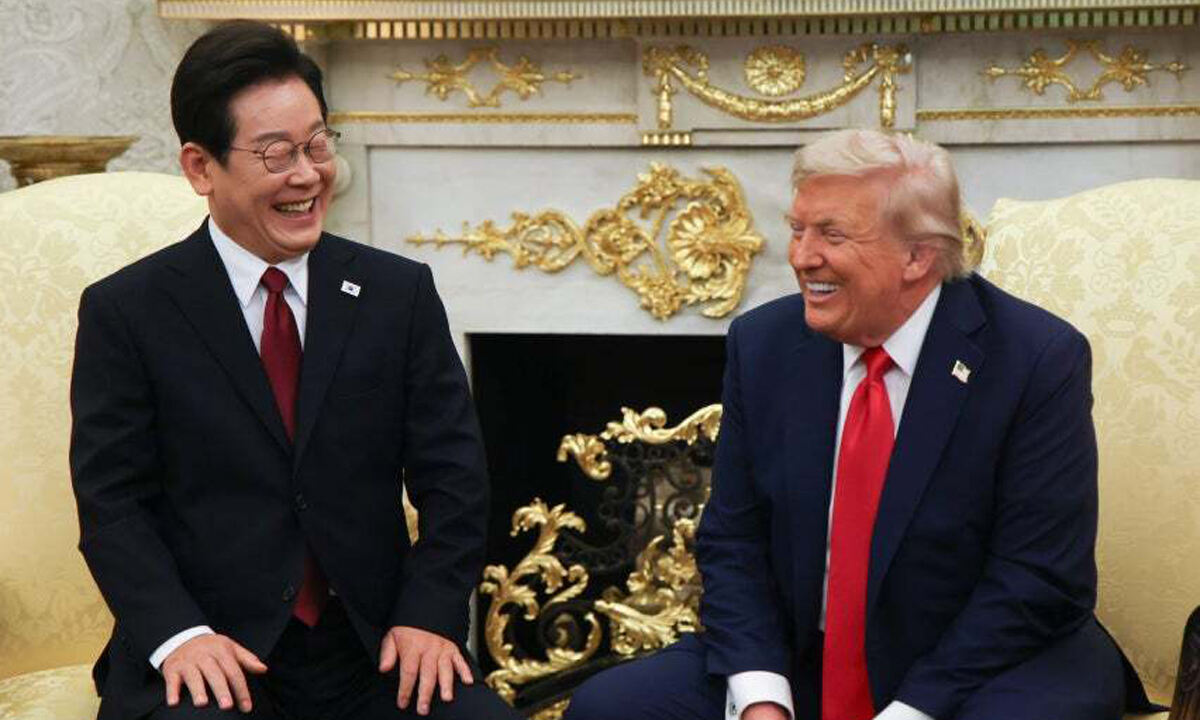 이재명 대통령이 지난 8월 25일(현지시간) 미국 워싱턴 DC 백악관 오벌오피스에서 도널드 트럼프 미국 대통령과 한미 정상회담을 하며 함께 웃고 있다. 연합뉴스 |