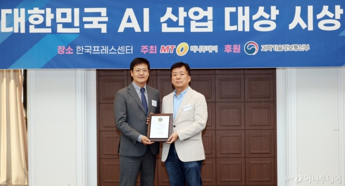원더풀플랫폼 구승엽 대표(오른쪽)가 '2025 대한민국 AI 산업 대상' 수상 후 머니투데이 송기용 전무(왼쪽)와 함께 기념 촬영을 하고 있다./사진=김창현 기자 |