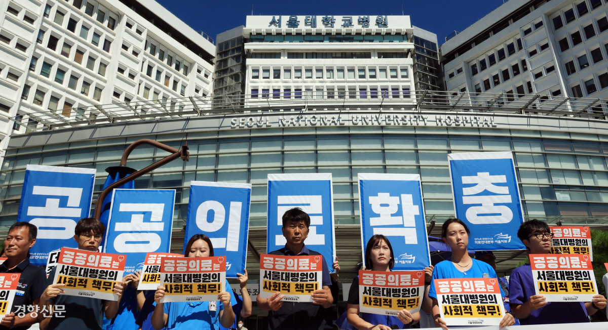 의료연대본부 서울대병원분회 조합원들이 10일 서울 종로구 서울대병원 앞에서 공공의료 확충을 요구하며 총파업 선포 기자회견을 하고 있다.