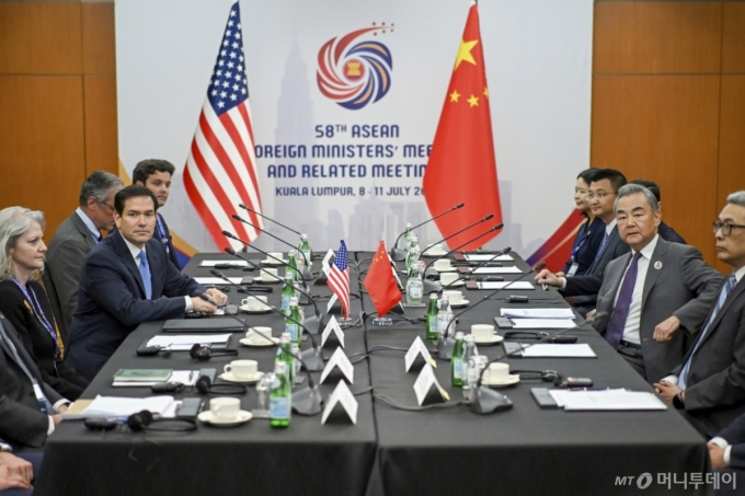 마코 루비오 미국 국무장관(왼쪽 앞에서 두번째)과 왕이 중국 외교부장(오른쪽 앞에서 두번째)이 지난 11일(현지시간) 말레이시아 쿠알라룸푸르 컨벤션센터에서 열린 제58차 동남아국가연합(ASEAN) 외교장관회의에서 양자 회담을 하고 있다. /쿠알라룸푸르(말레이시아) AP=뉴시스 |