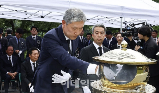 노태우 전 대통령 아들 노재헌씨가 지난달 18일 서울 동작구 국립서울현충원 고 김대중 전 대통령 묘역에서 분향하고 있다.(사진=연합뉴스) |
