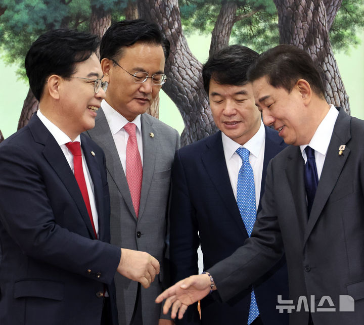 [서울=뉴시스] 김금보 기자 = 송언석(왼쪽) 국민의힘 원내대표와 김병기 더불어민주당 원내대표가 10일 오후 서울 여의도 국회에서 악수를 하고 있다. 왼쪽부터 국민의힘 송 원내대표와 유상범 원내운영수석부대표, 더불어민주당 문진석 원내운영수석부대표와 김 원내대표. 2025.09.10. kgb@newsis.com |
