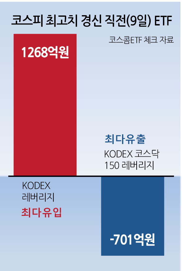 11일 코스콤ETF체크에 따르면 코스피가 사상 최고치를 기록하기 전날인 9일 기준 코스피200지수를 2배 추종하는 ‘KODEX 레버리지’로 하루 새 1268억원이 들어왔다.