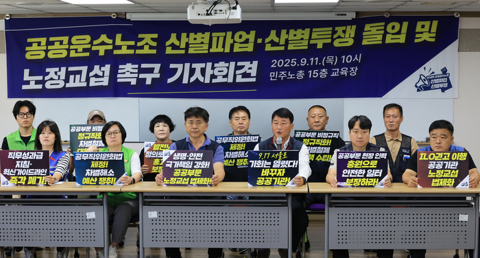 11일 공공운수노조는 서울 정동 민주노총에서 ‘공공기관 민주적 혁신과 비정규직 문제 해결을 위한 공공운수노조 파업돌입’ 기자회견을 열고 오는 17일부터 서울 도심에서 대규모 파업 집회를 연다고 밝혔다.