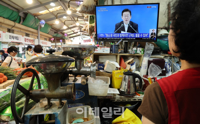 [이데일리 방인권 기자] 이재명 대통령의 취임 100일 기자회견이 열린 11일 서울 서대문구 인왕시장에서 상인들이 TV를 통해 기자회견 중계를 시청하고 있다.