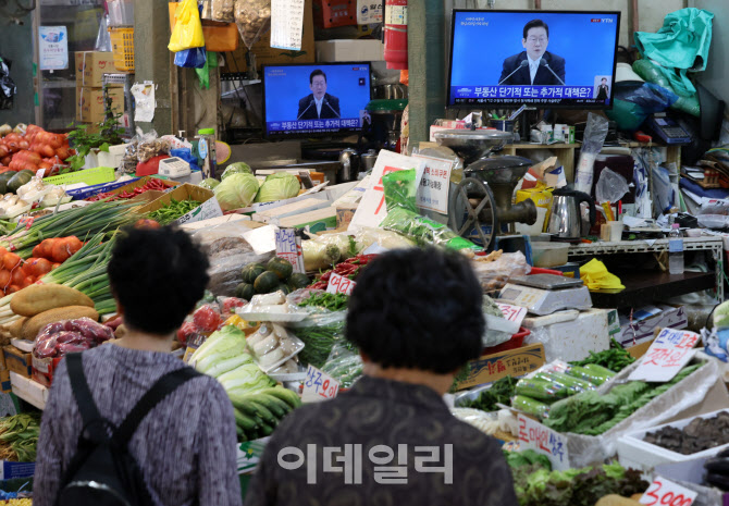 [이데일리 방인권 기자] 이재명 대통령의 취임 100일 기자회견이 열린 11일 서울 서대문구 인왕시장에서 상인들이 TV를 통해 기자회견 중계를 시청하고 있다.