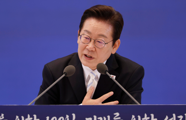 이재명 대통령이 11일 청와대 영빈관에서 열린 취임 100일 기자회견에서 취재진 질문에 답변하고 있다. 연합뉴스 |
