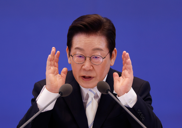 이재명 대통령이 11일 청와대 영빈관에서 열린 취임 100일 기자회견에서 취재진 질문에 답변하고 있다. 연합뉴스 |