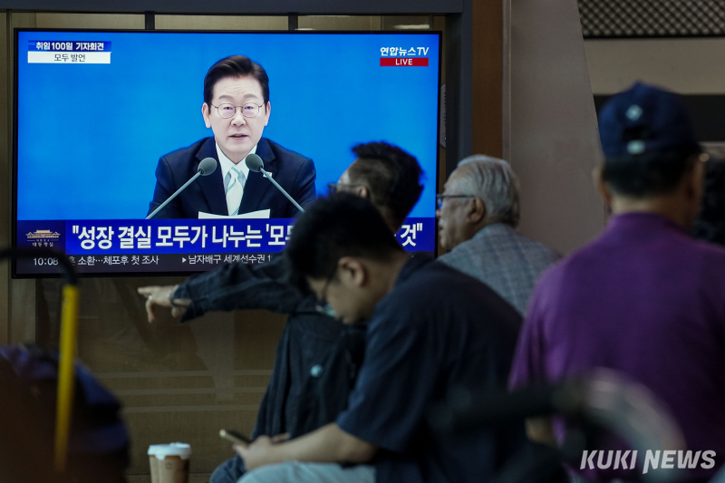 이재명 대통령이 청와대 영빈관에서 ‘취임 100일 기자회견’을 연 11일 서울역 대합실에서 시민들이 생중계 화면을 지켜보고 있다. 유희태 기자 |