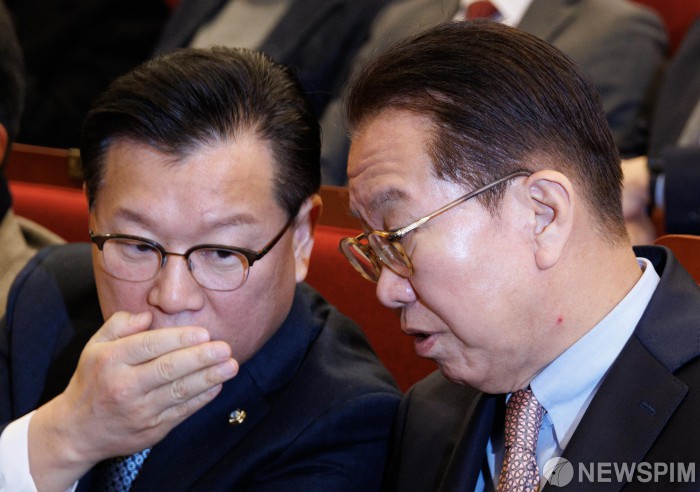 [서울=뉴스핌] 윤창빈 기자 = 권영세 국민의힘 비상대책위원장, 이양수 사무총장이 12일 오전 서울 여의도 국회 도서관에서 열린 87체제 극복을 위한 지방분권 개헌 토론회에서 대화를 나누고 있다. 2025.02.12 pangbin@newspim.com |