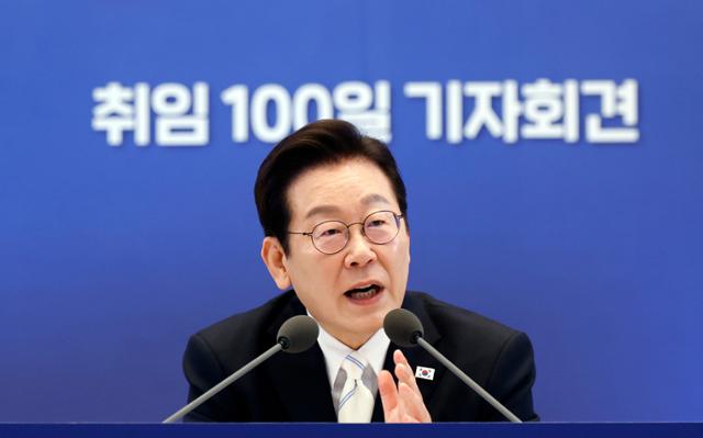 이재명 대통령이 11일 청와대 영빈관에서 열린 취임 100일 기자회견 '회복을 위한 100일, 미래를 위한 성장'에서 취재진의 질문에 답변하고 있다. 연합뉴스 |
