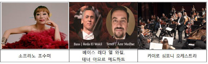 이번 협연에서 조수미는 카이로 오페라단의 수석 베이스 레다 엘 와킬과 테너 아므르 메드하트와 호흡을 맞춰 한국과 이집트 우정의 밤을 노래로 물들일 예정이다. 지휘는 아흐메드 엘 사디가 맡는다. 카이로 오페라 하우스는 1988년 설립된 이집트 대표 공연장으로 메인홀은 약 1200석 규모다