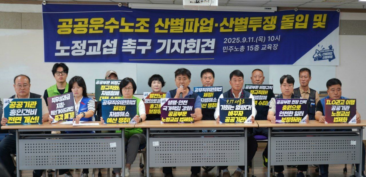 전국민주노동조합총연맹(민주노총) 산하 전국공공운수사회서비스노조(공공운수노조)는 11일 오전 서울 중구 민주노총 교육장에서 산별파업-산별투쟁 기자회견을 열고 이같이 밝혔다.