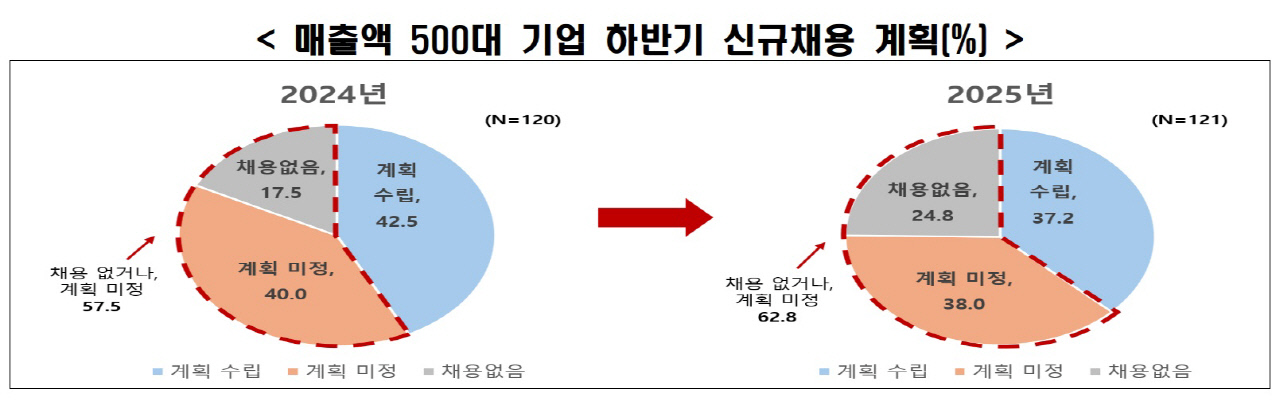 한국경제인협회(이하 한경협)는 여론조사기관 리서치앤리서치에 의뢰해 매출액 500대 기업을 대상으로 '2025년 하반기 대졸 신규채용 계획'을 조사한 결과, 응답기업 10곳 중 6곳(62.8%)은 올해 하반기 신규채용 계획을 수립하지 못했거나 채용하지 않을 것이라고 응답했다고 11일 밝혔다. 채용계획 미수립 기업은 38.0%, 채용이 없는 기업은 24.8%로 각각 조사됐다.