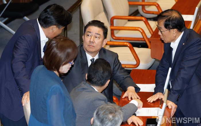 [서울=뉴스핌] 윤창빈 기자 = 김병기 더불어민주당 원내대표가 11일 오전 서울 여의도 국회에서 열린 본회의에서 동료 의원들과 대화를 나누고 있다. 2025.09.11 pangbin@newspim.com