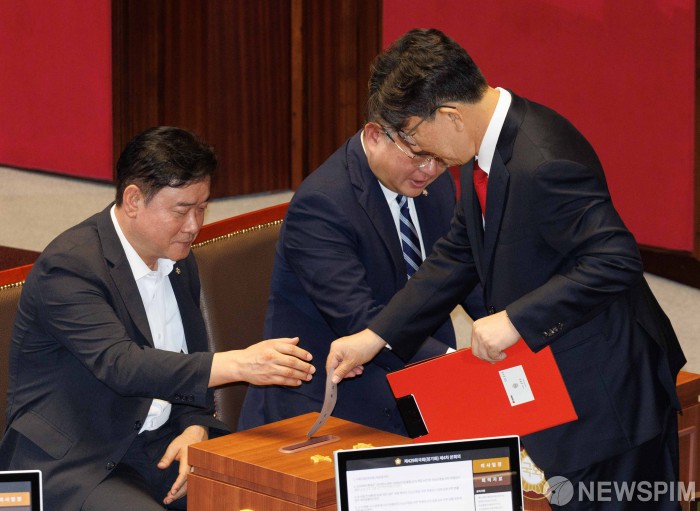 [서울=뉴스핌] 윤창빈 기자 = 권성동 국민의힘 의원이 11일 오전 서울 여의도 국회에서 열린 본회의에서 본인의 체포동의안 표결을 하고 있다. 2025.09.11 pangbin@newspim.com